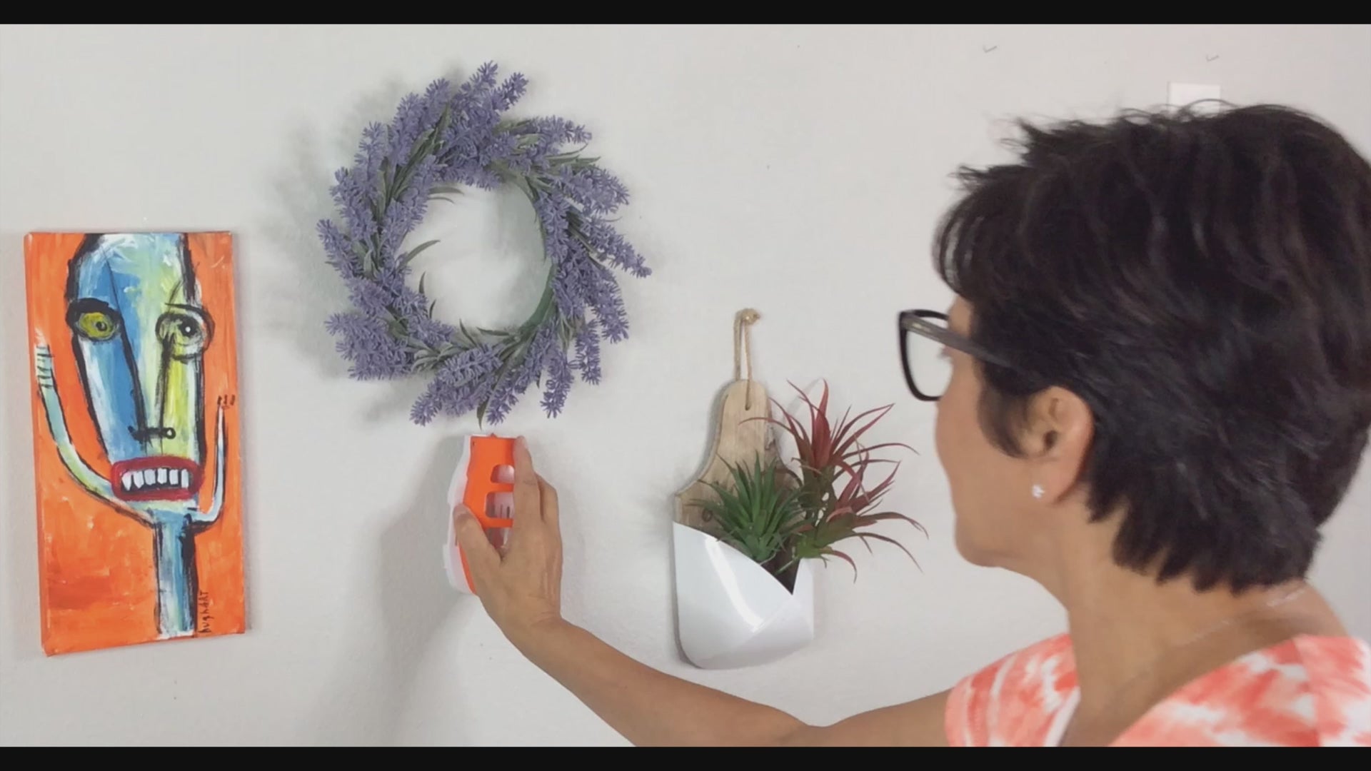 Hang 100's of items in seconds! No more smashed thumbs! No more holes in the wall! With Pop & Hang you simply load the nail into the magnetic Handle and Pop it into the wall! That's it...your done! Comes in Fire Orange and Lime Green!